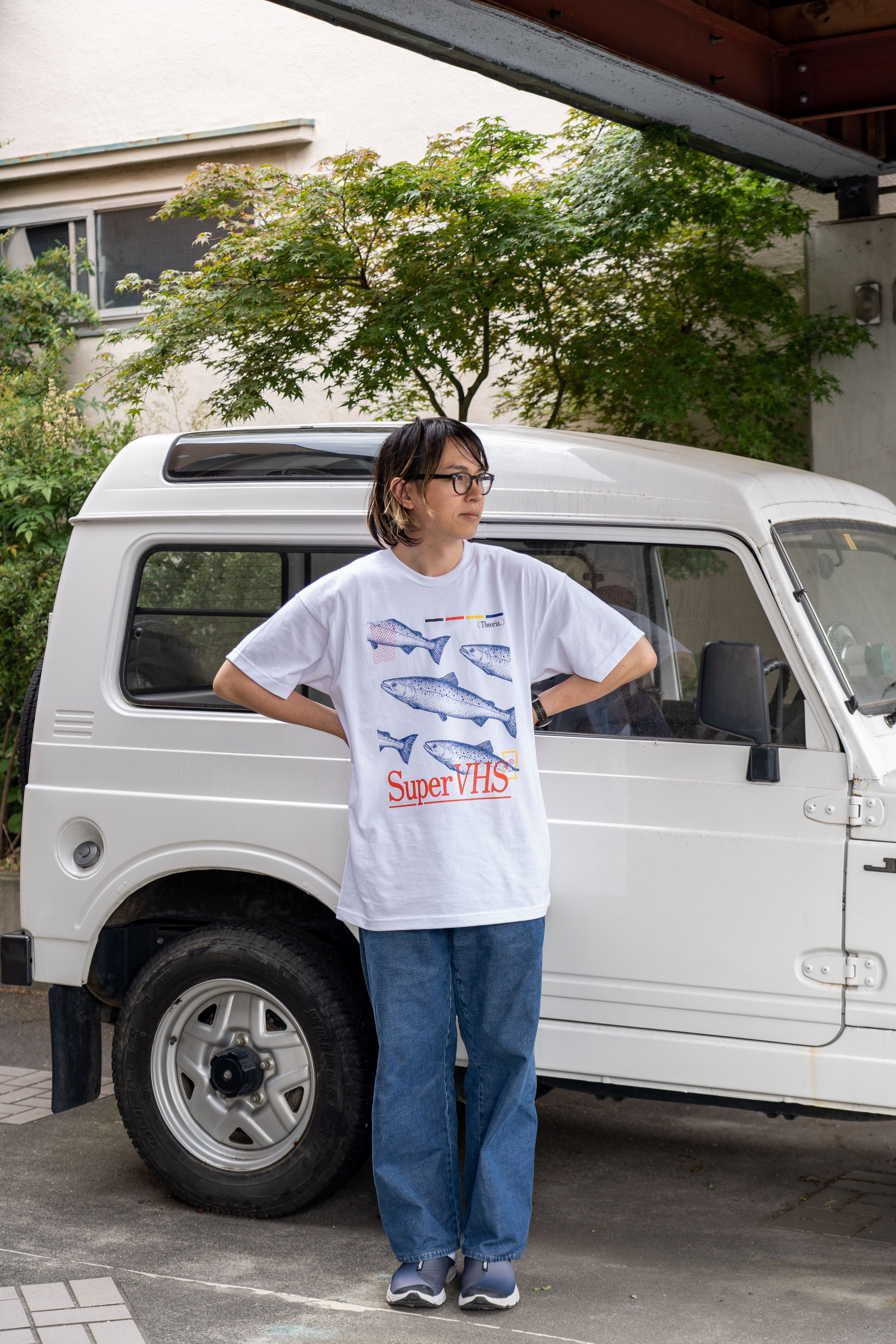 Super VHS「theoria tour 1994 T」。デザインはNAKED LANDSCAPE。Super VHSのセカンドアルバム『theoria』の空想のリリースツアーをテーマにデザインされています。表はシルクスクリーン4色、バックは1色です。
